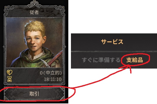 ・商人→従者→支給品から、初期装備を設定できます 服を着て、武器を持とう