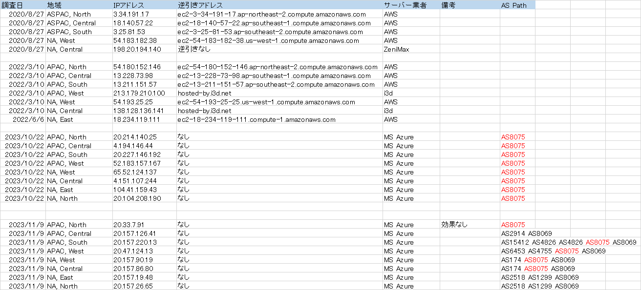 | 2023/11/16 | APAC, North | 20.157.12.206 | なし | MS Azure | KR→JP |